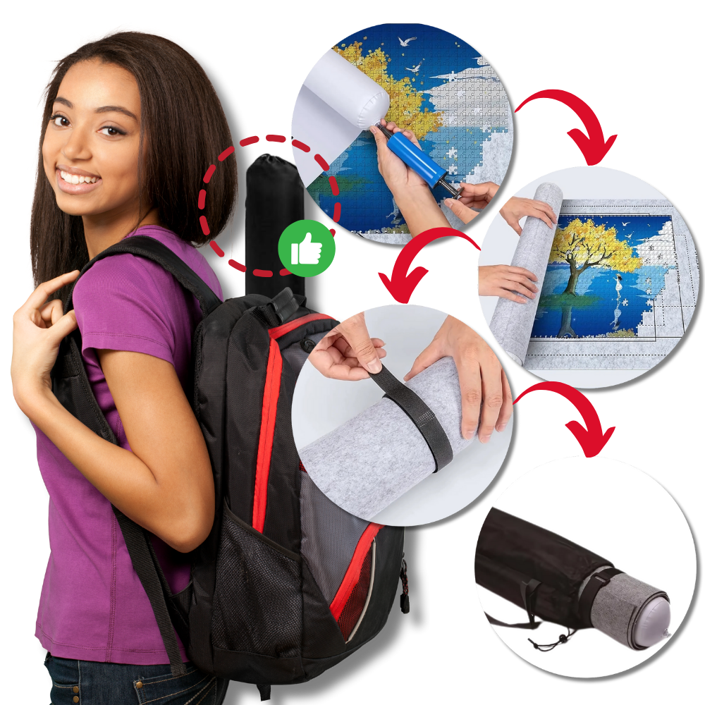 The Felt Puzzle Mat Roll Up holds from 1500 up to 3,000 pieces and easily rolls up to keep your puzzles safe and organized—perfect for home or travel.